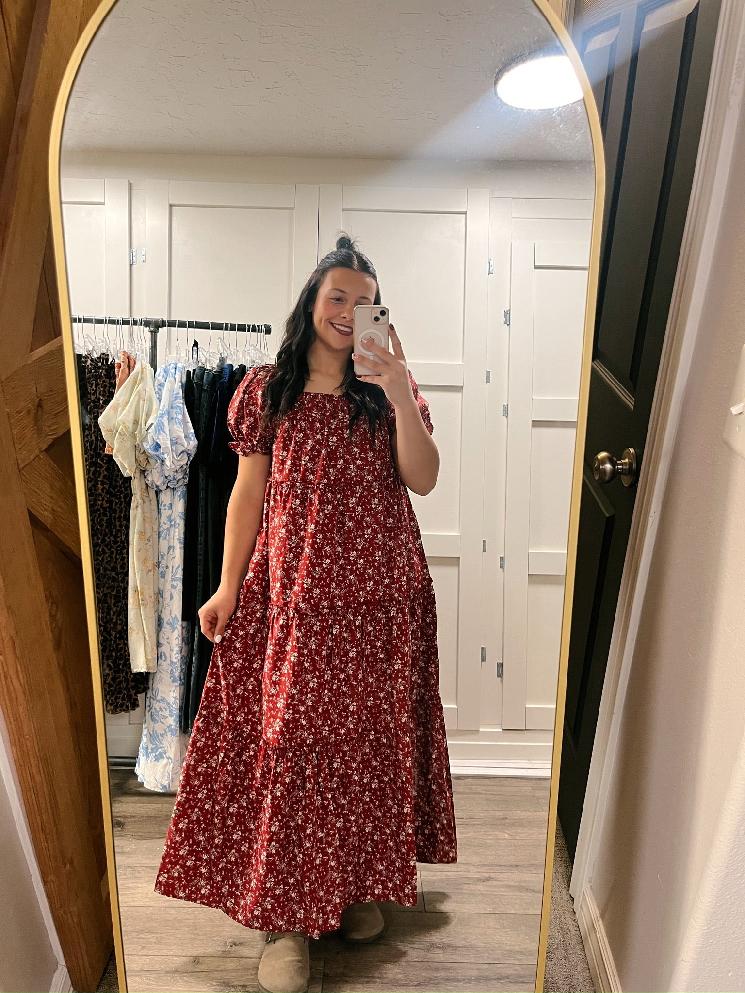 Relaxed fit maxi dress. Has pockets and elastic neck line with puffy sleeves!